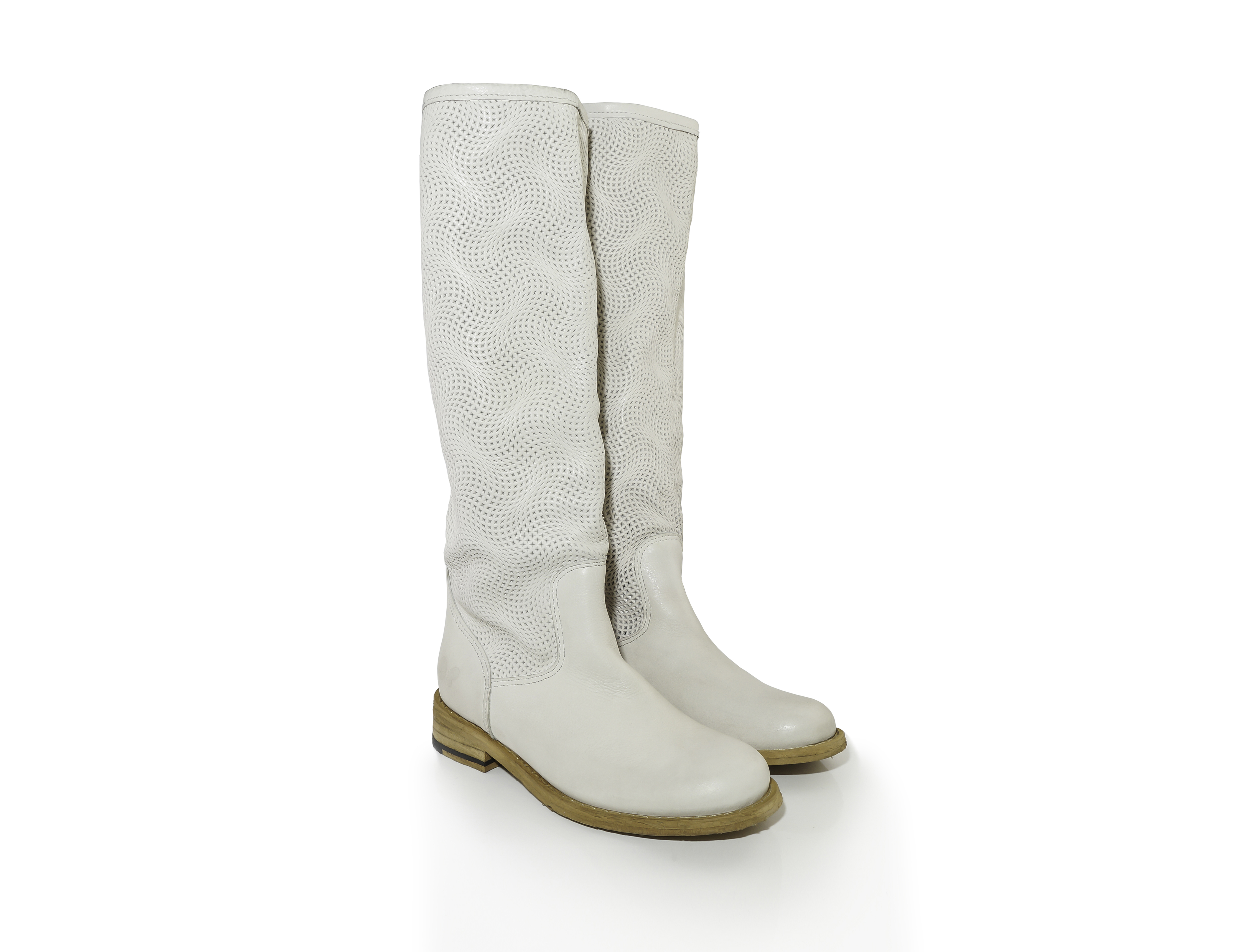 Botas de cano alto em pele com microperfuração no cano, sem forro nos canos e sola em Thunit.
